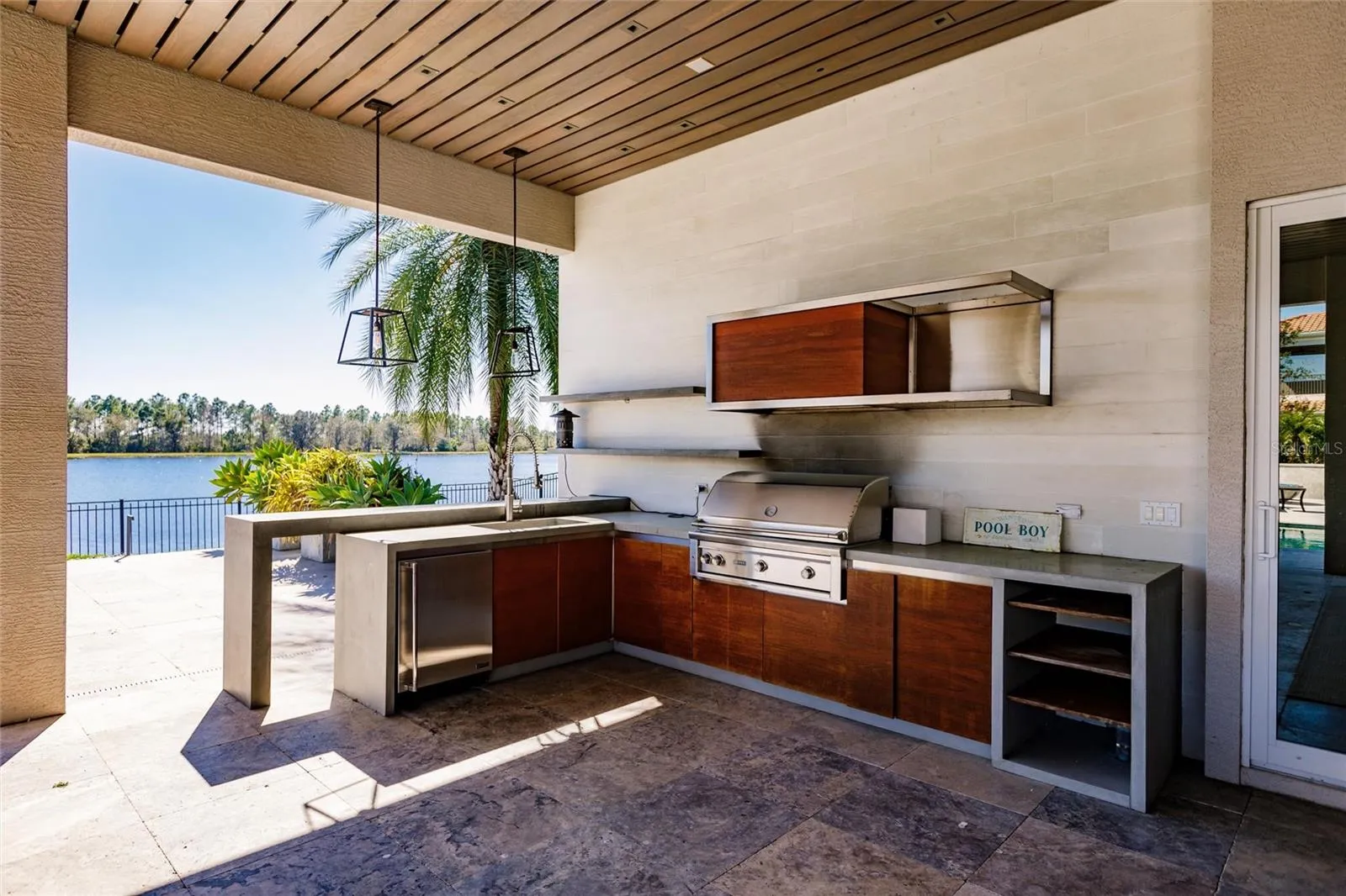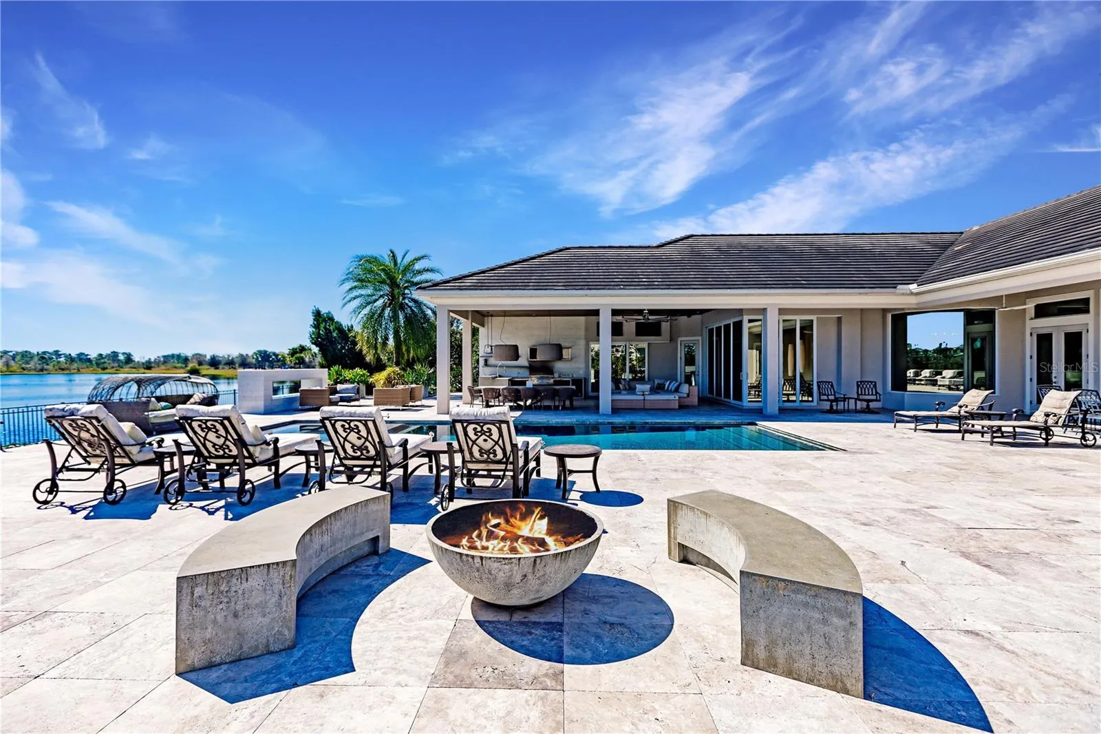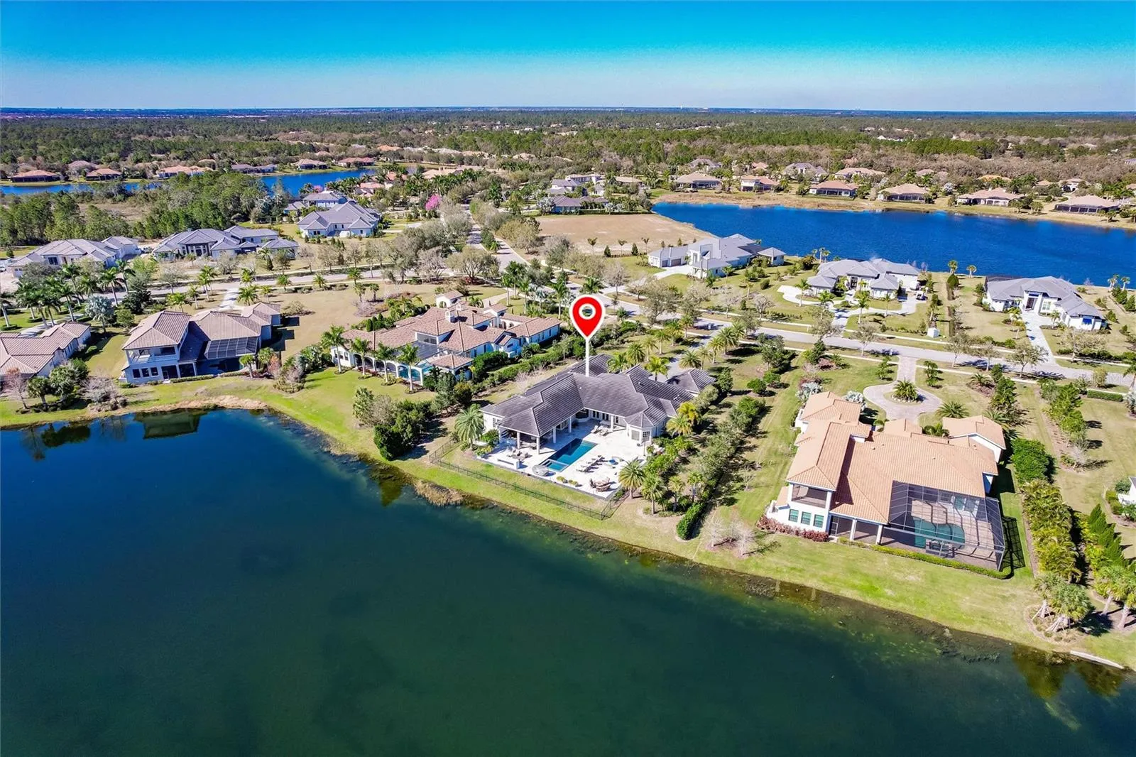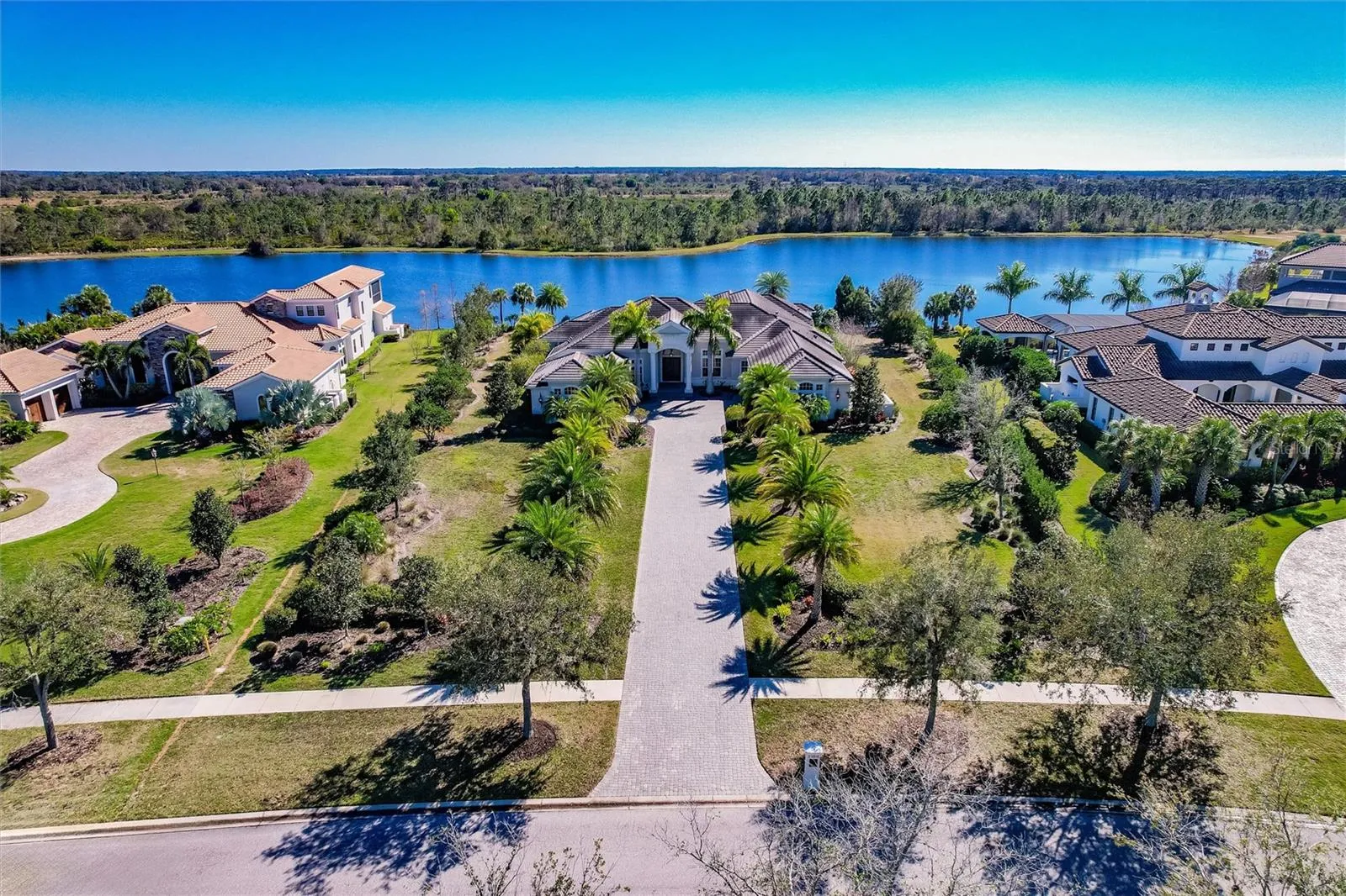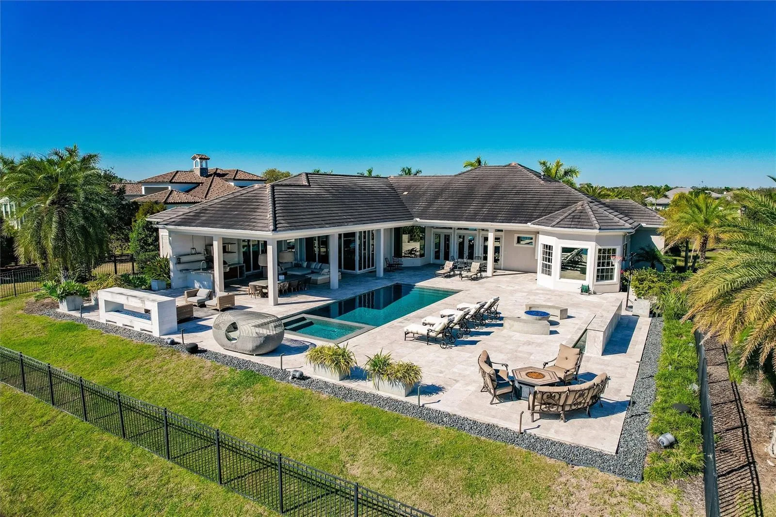 An exceptional estate with unmatched outdoor living. Experience luxury living in this custom-built Lakewood Ranch estate, gracefully situated on 1.19 acres of lush grounds in the exclusive gated community of The Concession. With over 5,000 square feet of thoughtfully designed living space, this home blends elegance, functionality, and serene natural beauty. OUTDOOR LIVING: Step outside and immerse yourself in the ultimate Florida lifestyle. The expansive lanai boasts a heated pool with an infinity spa, a tranquil water feature, and a travertine paver deck, creating an idyllic retreat. Entertain effortlessly in the fully equipped outdoor kitchen or unwind by the fire pit while taking in sweeping views of the serene lake and private preserve. This outdoor haven is perfect for relaxation and entertaining year-round. STORAGE AND PRIVACY: the home showcases a split floor plan with every bedroom featuring walk-in closets with custom built-ins and their own ensuite bathroom. The master suite is a private sanctuary featuring wood floors, a tray ceiling, and a warm sitting area. Dual dressing rooms offer ample storage, while the spa-inspired bathroom dazzles with marble countertops, an oversized walk-in shower, a freestanding tub, and tankless hot water. ELEGANT ENTERTAINING: The gourmet kitchen is a chef’s dream, adorned with stone countertops, a marble backsplash, top-tier appliances, and a walk-in pantry. Custom wood beams and zero-corner hurricane sliding doors in the family room create a seamless transition between indoor and outdoor living spaces. The formal dining and living areas are complemented by a built-out bar and a stunning wine closet with a wrought-iron gate, ideal for showcasing fine wines and spirits. A bonus room with a wet bar provides additional space for gatherings. SAFETY AND HURRICANE PROTECTION: This home is equipped with hurricane-impact windows throughout, a whole-house generator, a smart home equipment closet, and dual garages with space for four vehicles. These features, combined with the secure gated community setting, ensure peace of mind. EXCLUSIVE AMENITIES: The Concession spans over 1,200 acres with just 250 residences immersed in old Florida charm. It is home to the award-winning Concession Golf Club, featuring a Jack Nicklaus Signature Golf Course co-designed with Tony Jacklin. This world-class club has hosted elite tournaments, including the World Golf Championships and NCAA Championships. Minutes from the vibrant shopping, dining, and entertainment of UTC, Benderson Park, Main Street, and Waterside, this estate offers the perfect balance of tranquility and accessibility with none of the CDD fees.