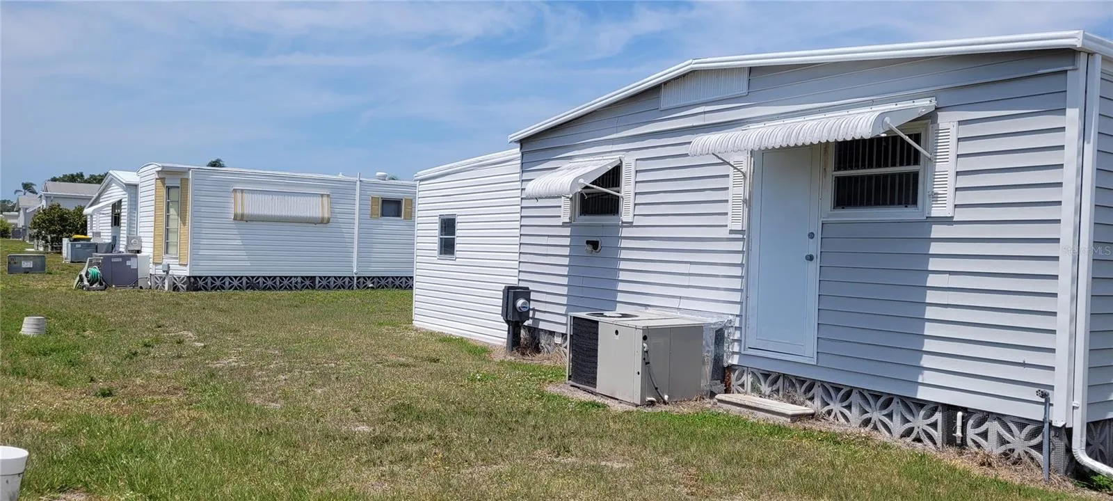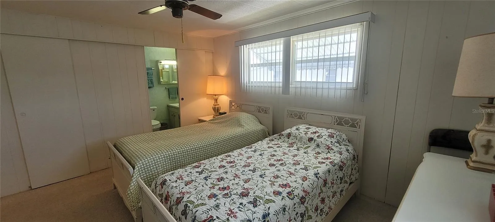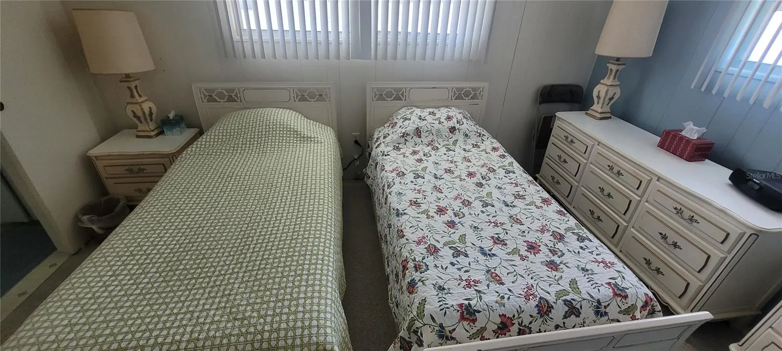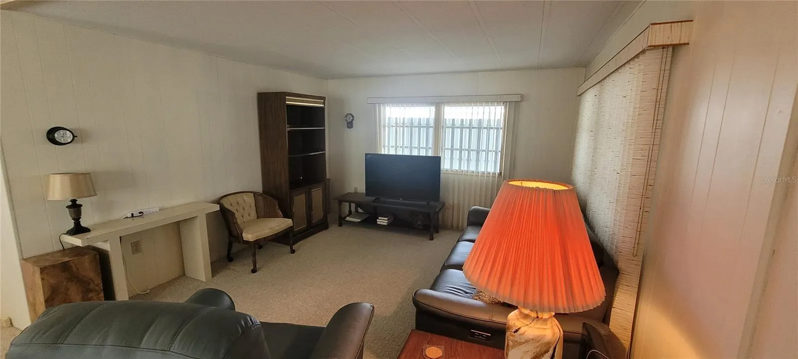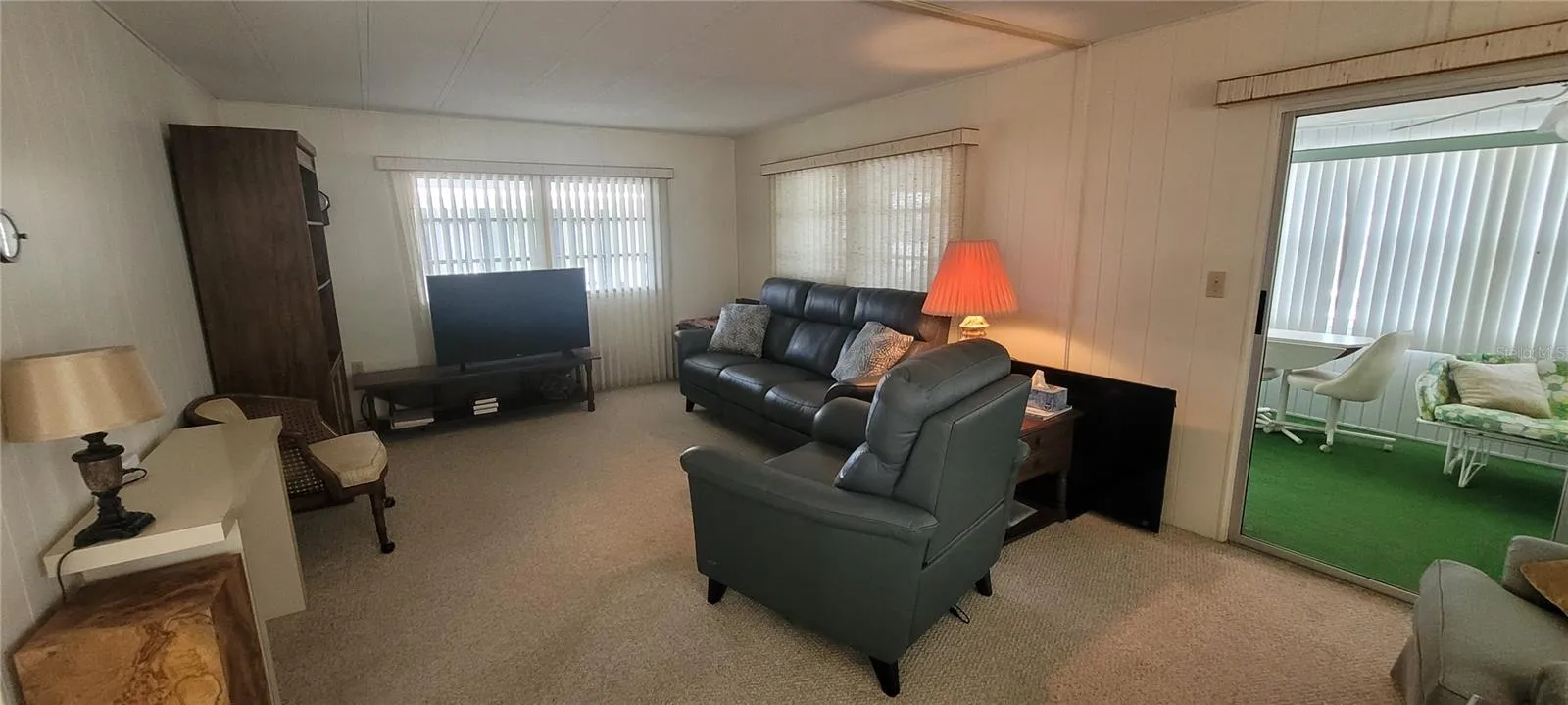 The kitchen is quite spacious and has a pantry with additional storage cabinet. Dining room is adjacent to the kitchen and living room and has an oval table set and bamboo design double server that opens to give additional buffet style serving space. The living room has a newer reclining sofa and chair set, flat screen TV and other furnishings. Just off the living room are sliders to the large Florida Room with wall to wall windows and a separate entry door. This North facing Florida room allows for shading/all day use. The primary suite has 2 twins that can be made into a king and dresser set. There is a walk in closet and wall closet with decorative doors. The en suite bath has a single vanity and step in shower. The guest bedroom has 2 twin beds and decorative closet doors as well. The guest bath is has vanity, tub/shower combo and linen closet. The washer/dryer are housed in the large shed along with a utility sink and lots of storage space/shelves. AC and water heater are older but running just fine. Main rooms have Berber carpet, kitchen and baths have linoleum and Florida room has outdoor carpeting.