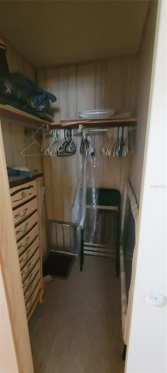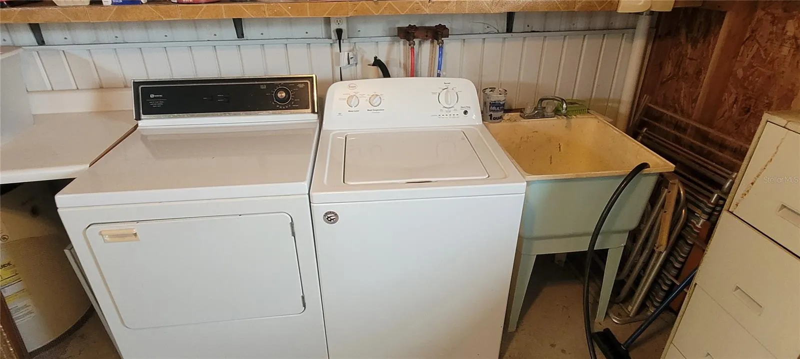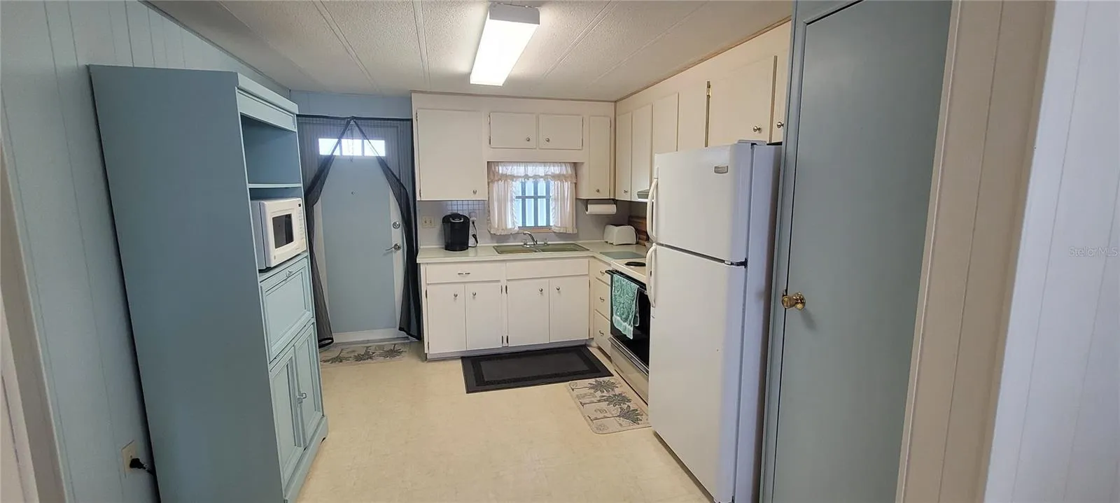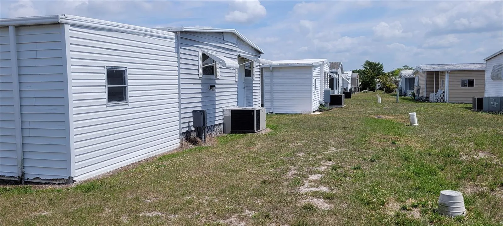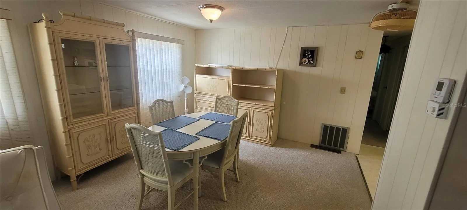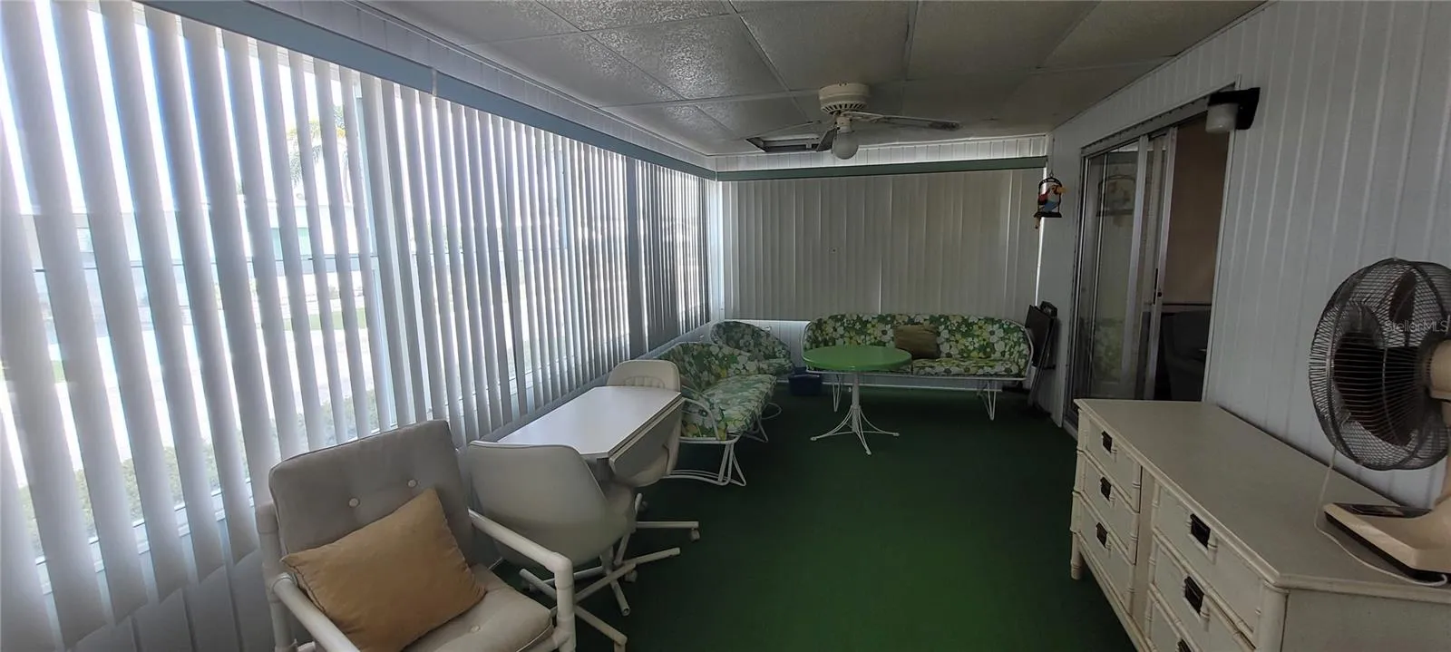 The kitchen is quite spacious and has a pantry with additional storage cabinet. Dining room is adjacent to the kitchen and living room and has an oval table set and bamboo design double server that opens to give additional buffet style serving space. The living room has a newer reclining sofa and chair set, flat screen TV and other furnishings. Just off the living room are sliders to the large Florida Room with wall to wall windows and a separate entry door. This North facing Florida room allows for shading/all day use. The primary suite has 2 twins that can be made into a king and dresser set. There is a walk in closet and wall closet with decorative doors. The en suite bath has a single vanity and step in shower. The guest bedroom has 2 twin beds and decorative closet doors as well. The guest bath is has vanity, tub/shower combo and linen closet. The washer/dryer are housed in the large shed along with a utility sink and lots of storage space/shelves. AC and water heater are older but running just fine. Main rooms have Berber carpet, kitchen and baths have linoleum and Florida room has outdoor carpeting.