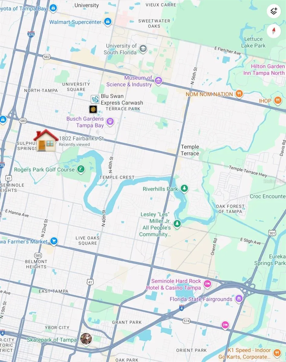 I-275 N 2 min (0.7 mi) Head north on N Florida Ave toward E Tyler St 0.3 mi Turn right onto E Scott St 0.2 mi Turn left to merge onto I-275 N 0.2 mi Follow I-275 N to FL-580 E/State Rd 580 E/E Busch Blvd. Take exit 50 from I-275 N 6 min (5.4 mi) Merge onto I-275 N 5.2 mi Take exit 50 for FL-580/Busch Blvd. Continue on FL-580 E/State Rd 580 E/E Busch Blvd. Drive to Fairbanks St 4 min (1.3 mi) Use the left 2 lanes to turn left onto FL-580 E/State Rd 580 E/E Busch Blvd 0.9 mi Turn right onto N 18th St 0.4 mi Turn left onto Fairbanks St Destination will be on the left 49 feet 1802 Fairbanks St Tampa, FL 33604