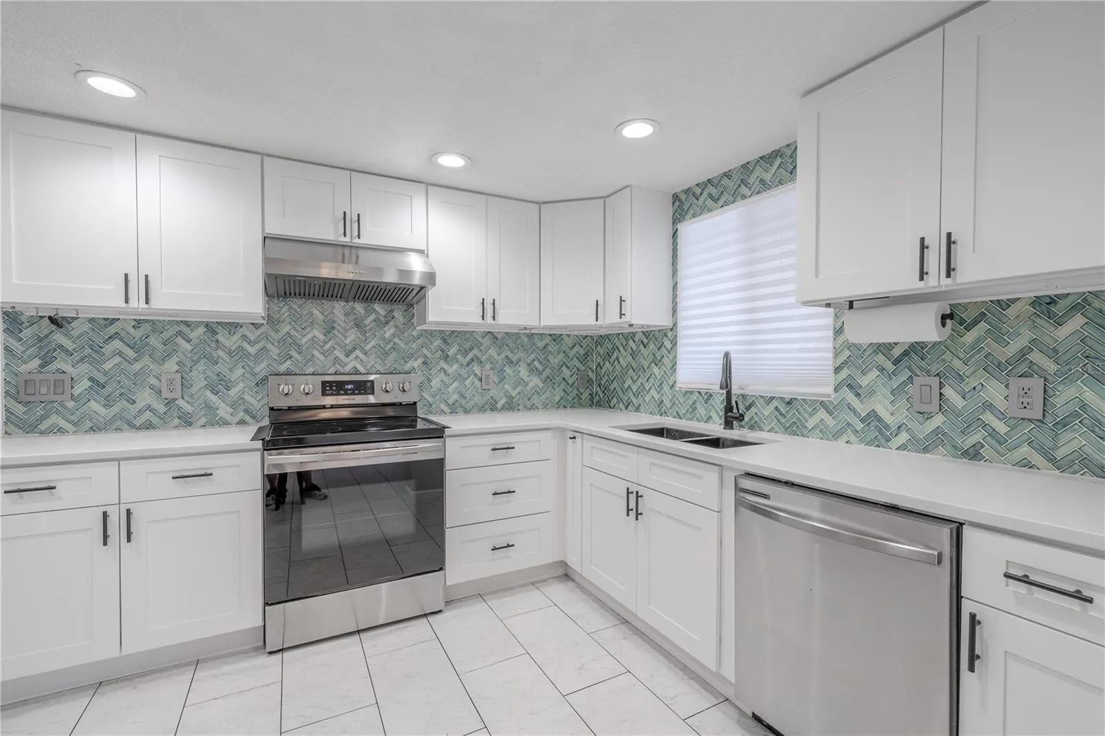 The stunning kitchen offers shaker-style cabinetry, sleek quartz countertops, stainless steel appliances, and a vibrant sea-glass-inspired herringbone tile backsplash that brings a splash of color and texture. Recessed lighting, a large window over the sink, and neutral tile flooring complete the space with both elegance and practicality.