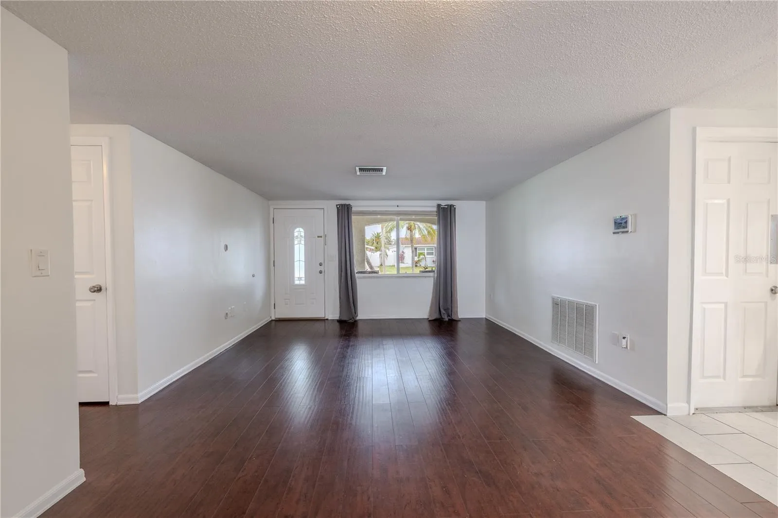 Inside is a bright and airy living room where sunlight pours through the large front window, highlighting the rich wood flooring that runs throughout the main living areas. Clean, neutral-toned walls provide a versatile backdrop for any style. The open layout flows seamlessly into the kitchen and adjacent dining area, making everyday living and entertaining easy.