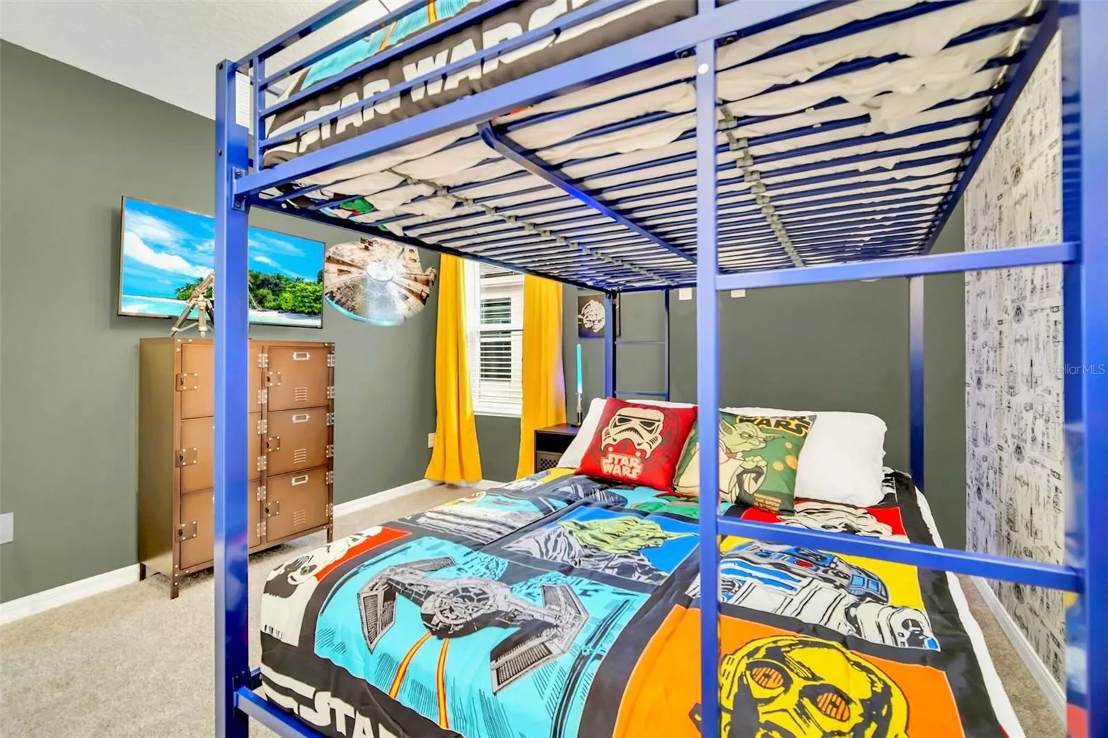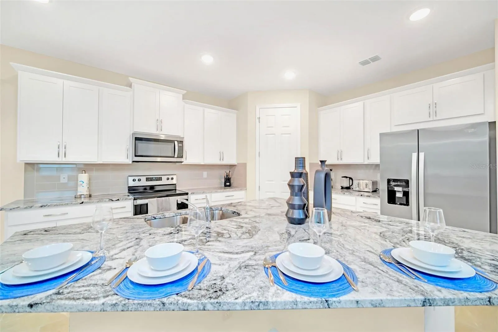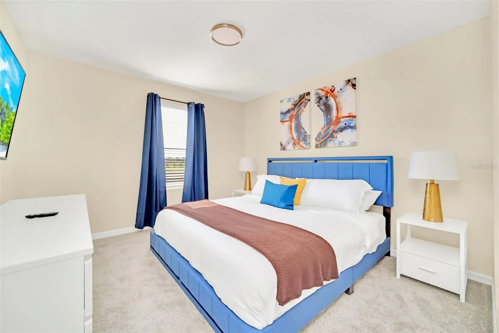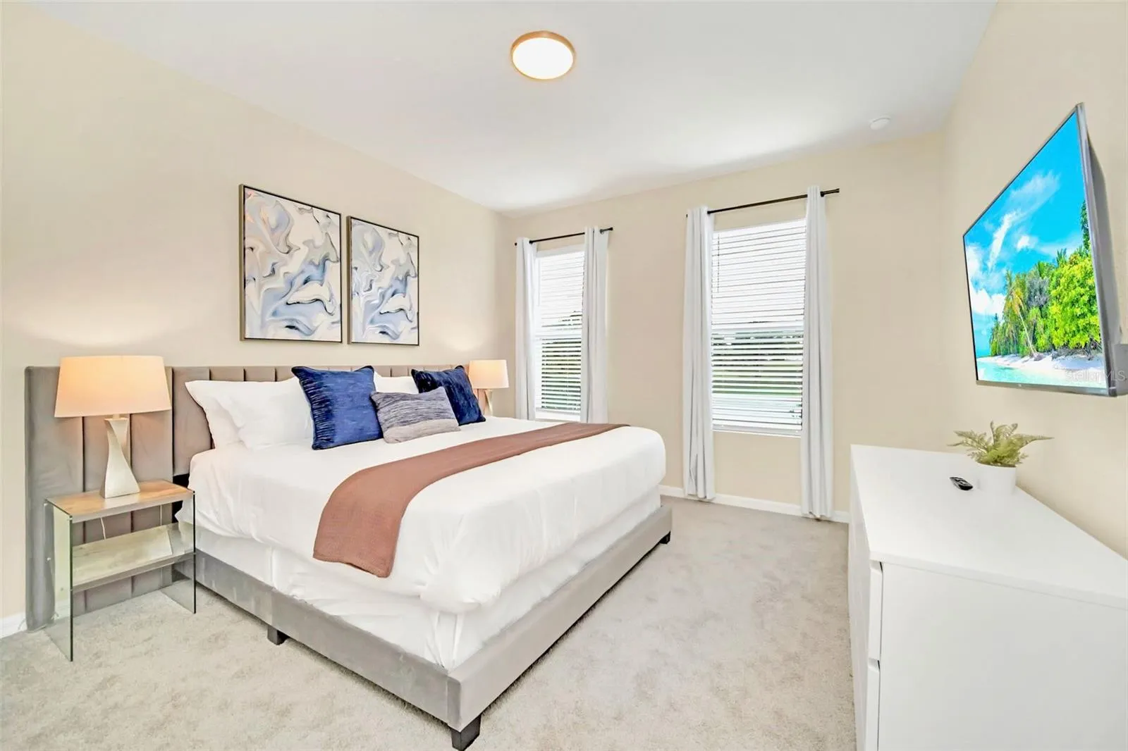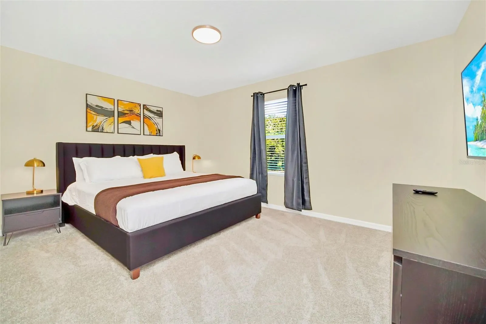 Experience the pinnacle of vacation living in this stunning, fully furnished Solara Resort home. Boasting 7 bedrooms and 6.5 baths, this professionally decorated property offers preserve views from the private, screened-in pool and spa and beautiful lake views from the front.