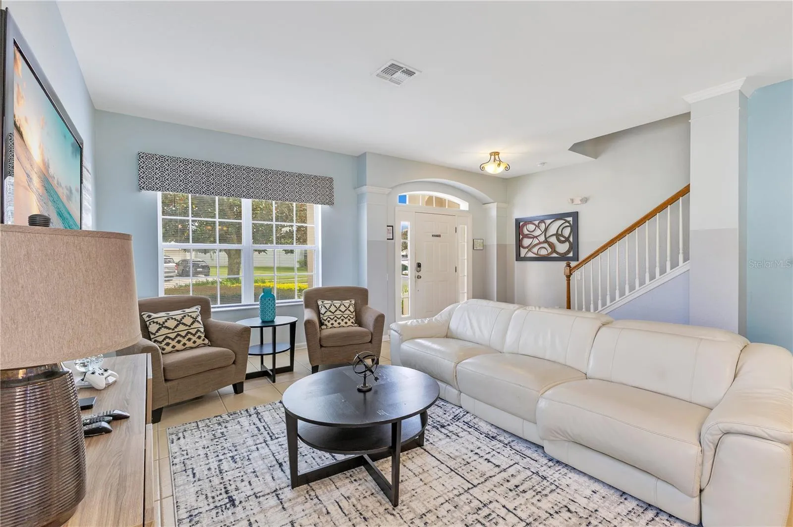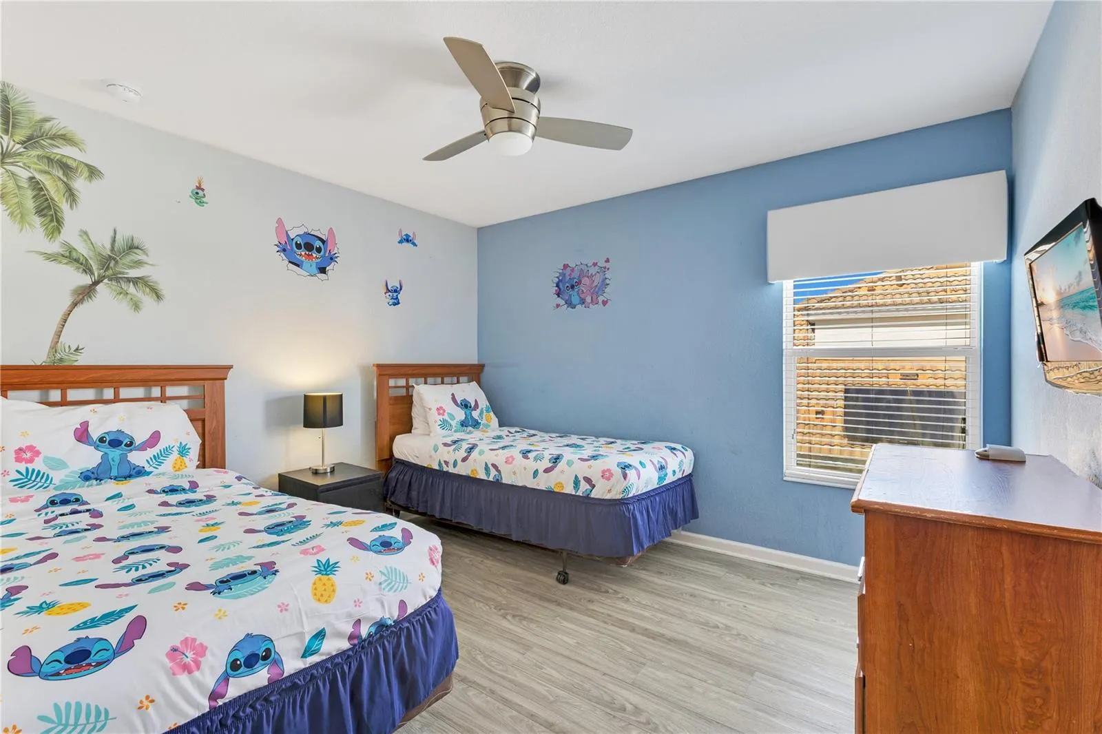 This fully furnished 6-bedroom, 4-bathroom home includes a converted garage theater room with new split AC (2023), a large projector screen, and brand-new reclining chairs (2024)—a highlight for family fun and vacation guests. The interior is move-in ready with no carpet: tile throughout the first floor and new vinyl flooring (2021) in all bedrooms and stairs. The layout offers one bedroom and full bath downstairs, with five additional bedrooms upstairs. The spacious master suite enjoys sweeping views, while two themed bedrooms—Stitch and Star Wars—add a playful touch for vacationers.