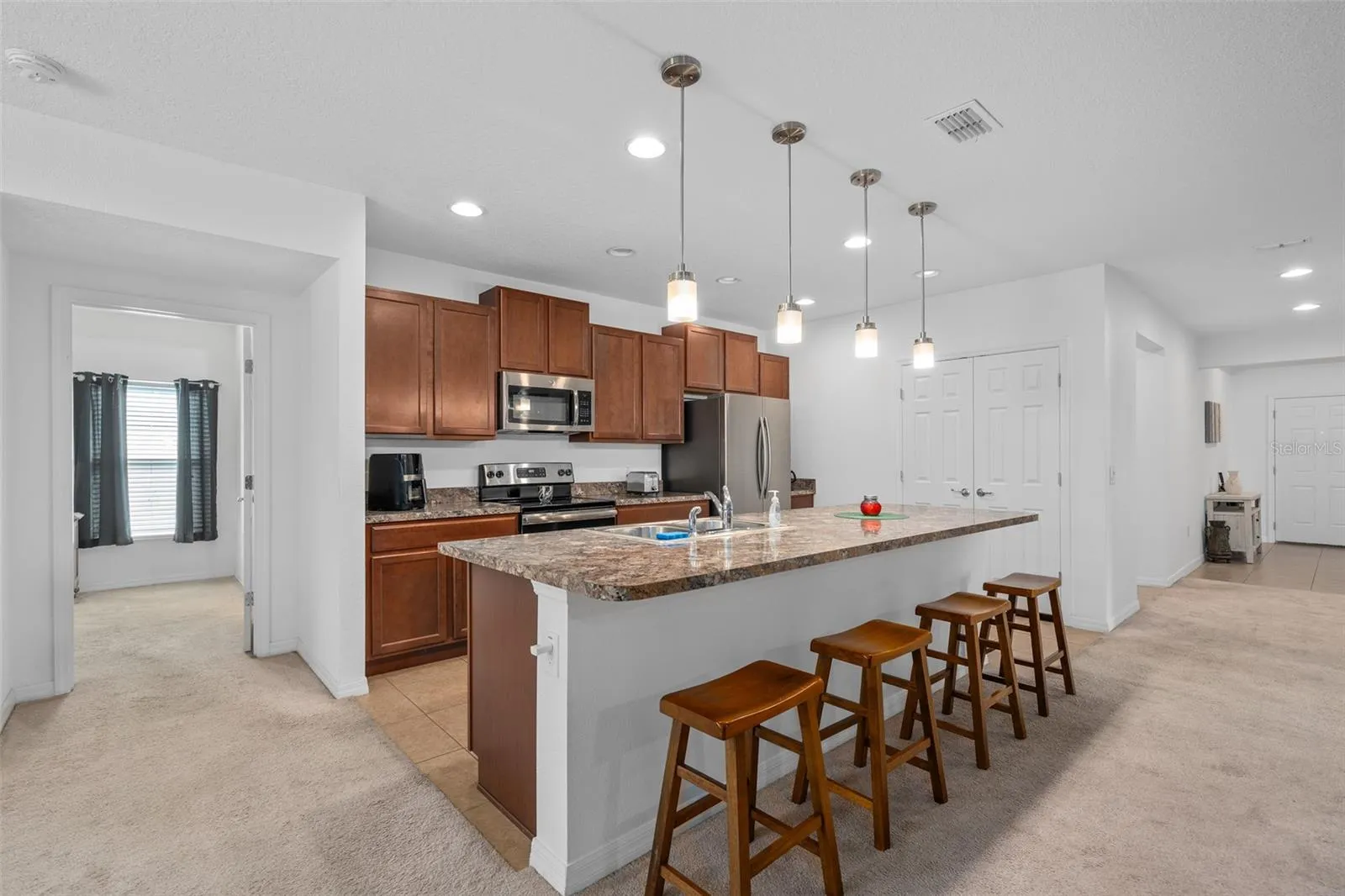 The heart of the home is the chef’s kitchen, boasting a large island, pendant and recessed lighting, and an open layout that flows seamlessly into the living and dining areas, perfect for family gatherings and entertaining.