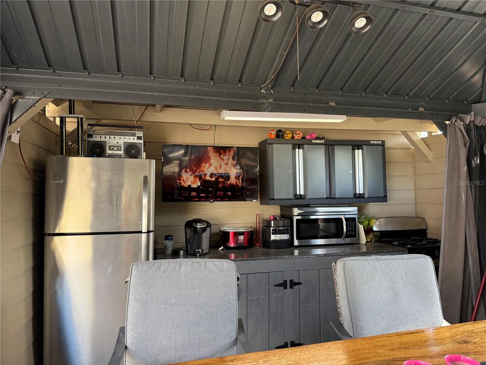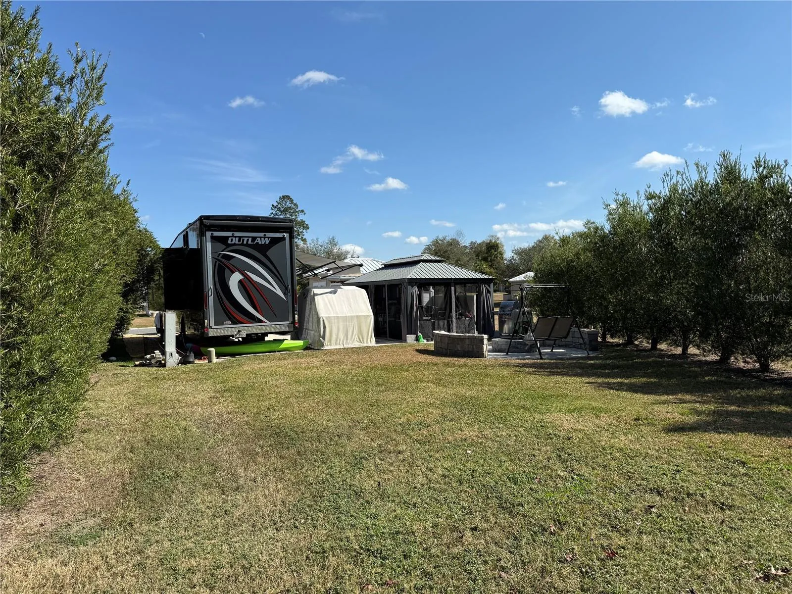 Outdoor living is taken to the next level with double screened gazebos with power, offering the perfect space for entertaining. The outdoor kitchen, complete with a TV, refrigerator, and ample counter space, makes meal prep a breeze—plus, you’ll love cooking on the gas stove under the stars. With all these amenities, your RV will be just for sleeping!