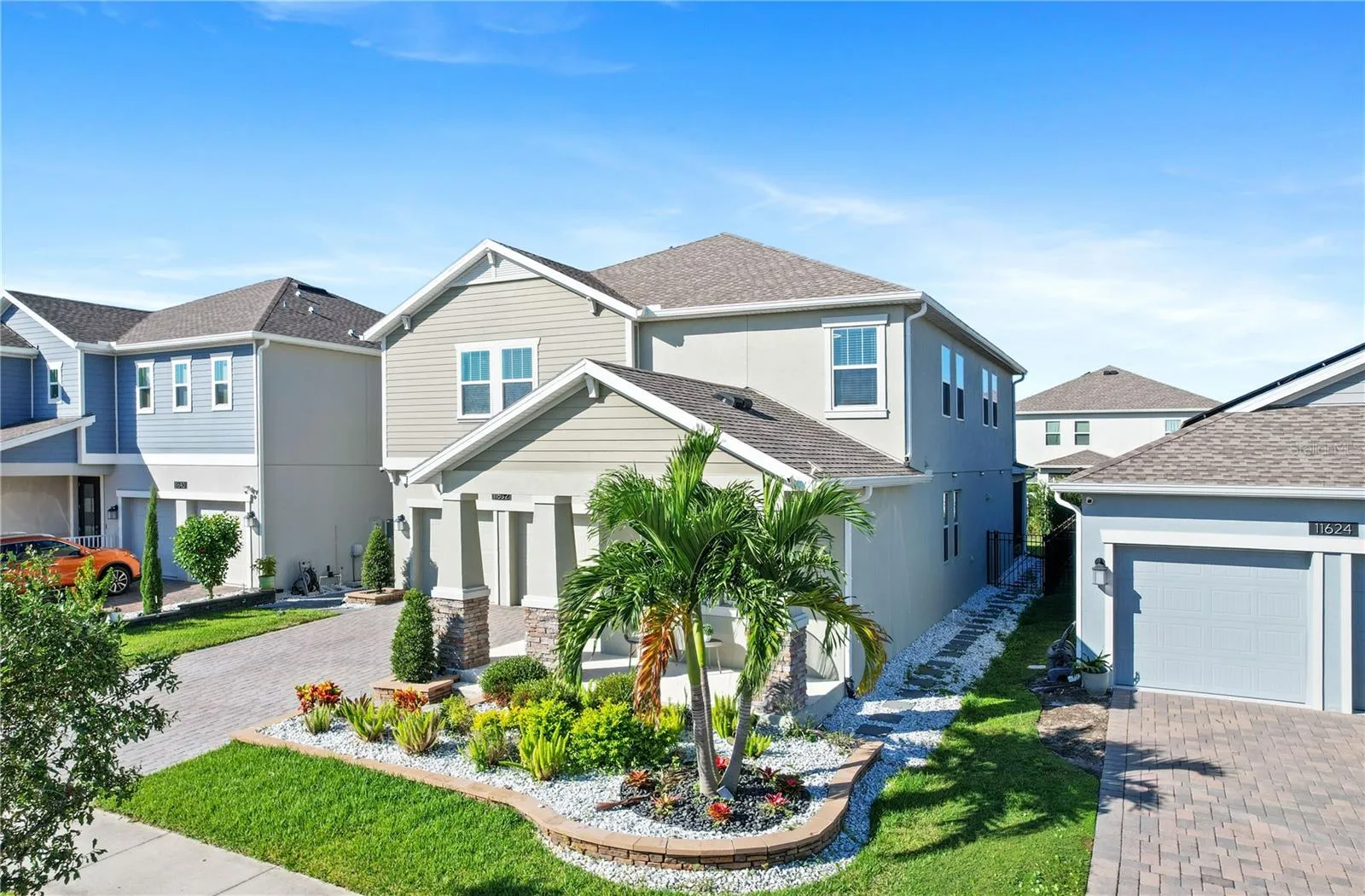 Welcome to 11632 Paragraph Road, a stunning 5-bedroom, 3-bathroom dream home located in the highly sought-after community of Storey Park in Lake Nona! This spacious Peabody floorplan spans two levels and offers the perfect blend of luxury, comfort, and functionality. With a spacious two-car garage and plenty of living space, this home is designed for families of all sizes. The main floor features beautiful wood plank tile flooring throughout, a versatile flex space or guest bedroom with a full bathroom off the foyer, a formal dining room, a large open-concept family room, and a dedicated home office—offering multiple spaces to work, play, and relax. The chef’s dream kitchen boasts stainless steel appliances, quartz countertops, a stylish tile backsplash, and a cozy breakfast nook that overlooks a covered patio—perfect for morning coffee or entertaining.