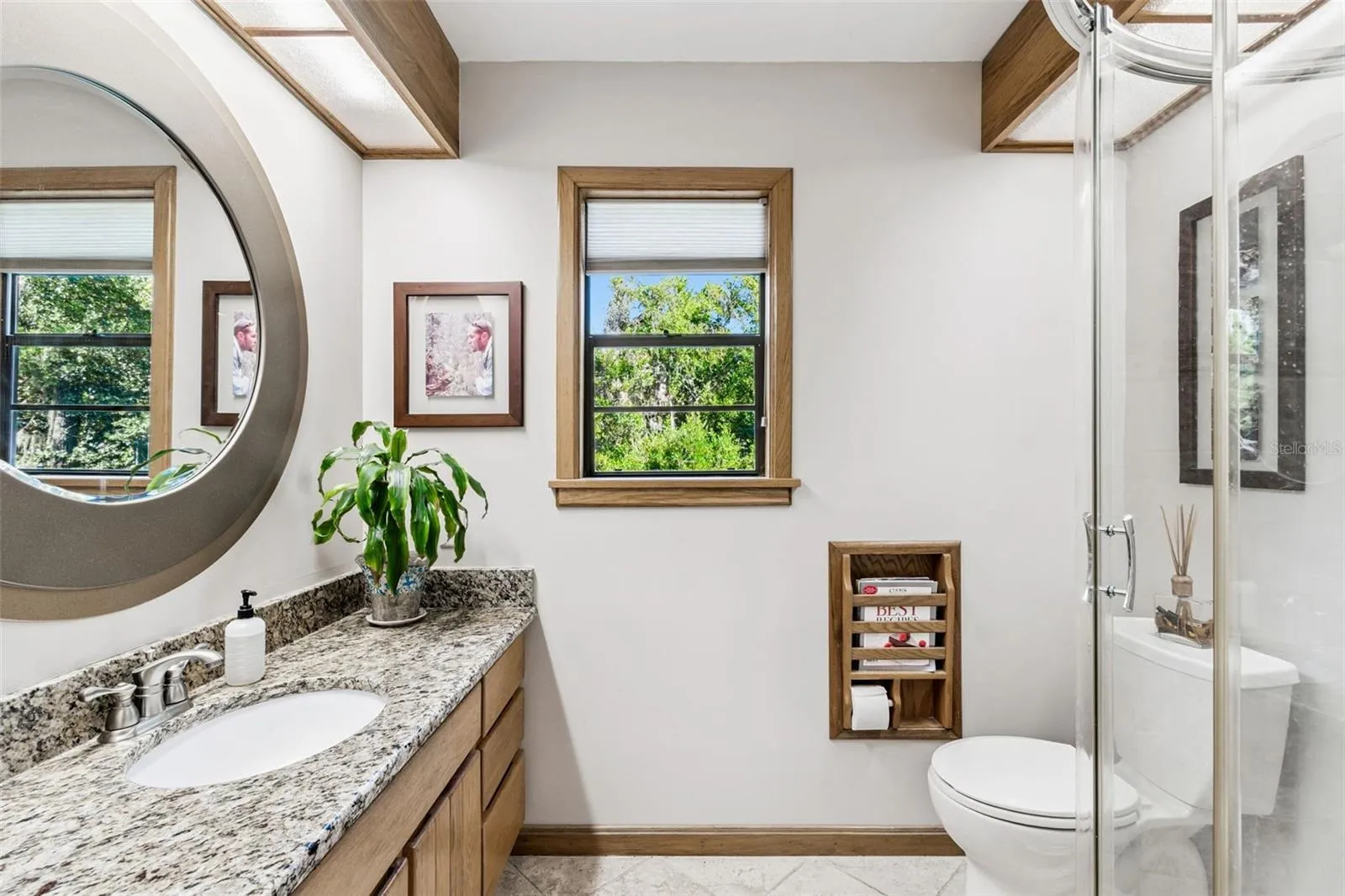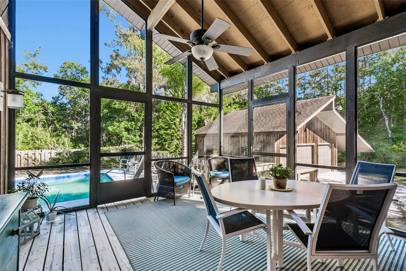 Discover a truly rare offering in Golden Acres! A beautifully crafted 3 bedroom, 2 bath pool home with a detached 2 car garage and a full Florida basement, situated on a private wooded corner lot with no neighbors beside you. This inviting residence features warm wood flooring, vaulted ceilings with exposed beams, abundant natural light, and custom hand built cabinetry throughout. The farmhouse style kitchen includes granite counters, a built in farm table, and a hidden butler’s pantry, while the main level also offers an updated full bath and spacious living and dining areas. The rare full basement provides year round cool temperatures, storage rooms, laundry, mechanicals, and flexible living space. Upstairs includes two generous bedrooms, an updated bath, and a large primary bedroom with a walk in closet and access to a private wraparound balcony overlooking the tranquil, wooded grounds. Outdoor living shines with multiple porches, an open deck, a fully fenced pool area with screened lanai, and ample parking for boats or equipment. The oversized detached garage offers vaulted ceilings and exceptional storage, completing this one-of-a-kind property. Homes with this character, craftsmanship, privacy, and land are rarely available especially under $500K—making this Golden Acres treasure a must see (ROOF-2010)(A/C-2019)