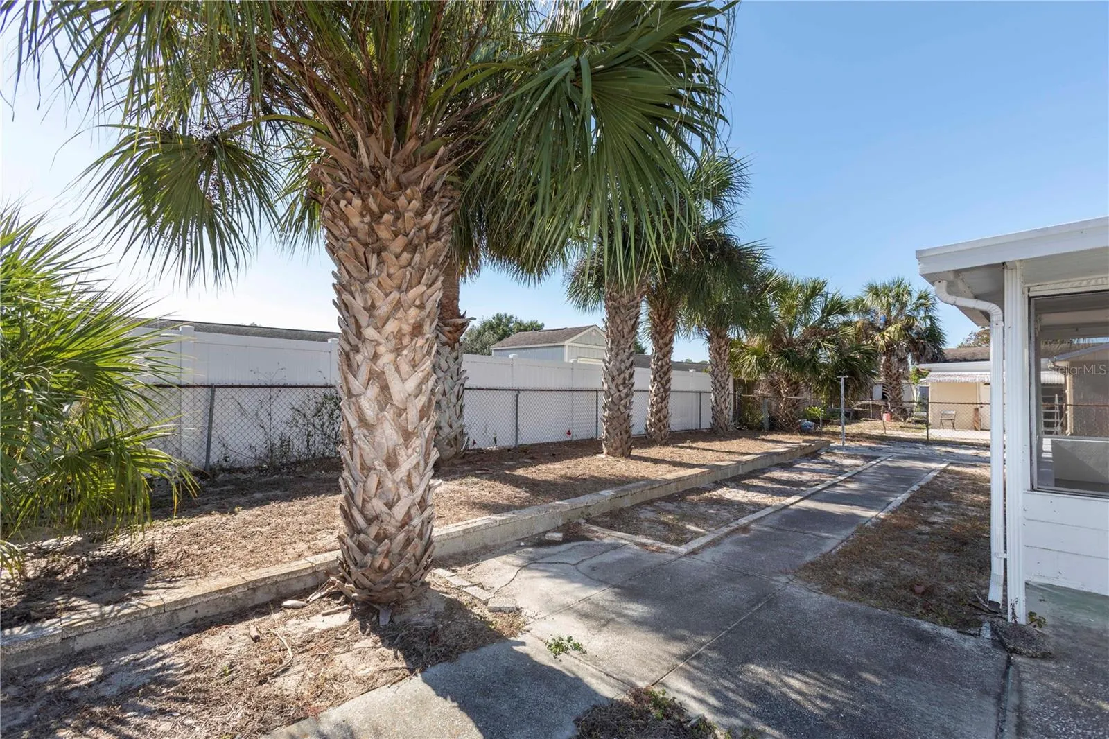 friends. The fenced-in yard offers plenty of space to entertain and is beautifully accented with palm trees,