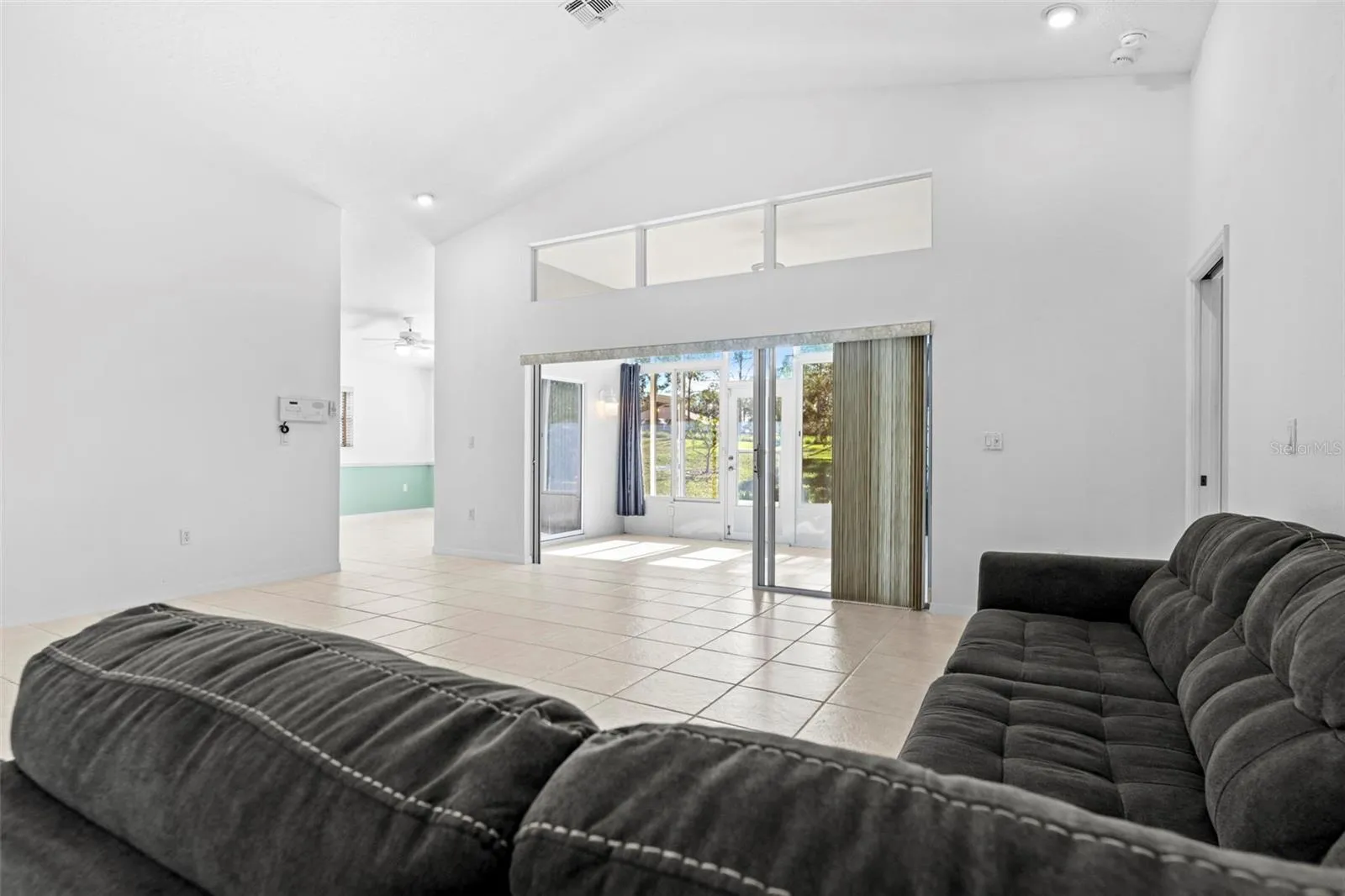 The bright, open layout includes a spacious kitchen with a breakfast bar and dining area, plus triple sliders leading to a large acrylic-enclosed lanai. Outside, enjoy a tiled grilling pad with awning and a backyard shaded by beautiful, mature oak trees.