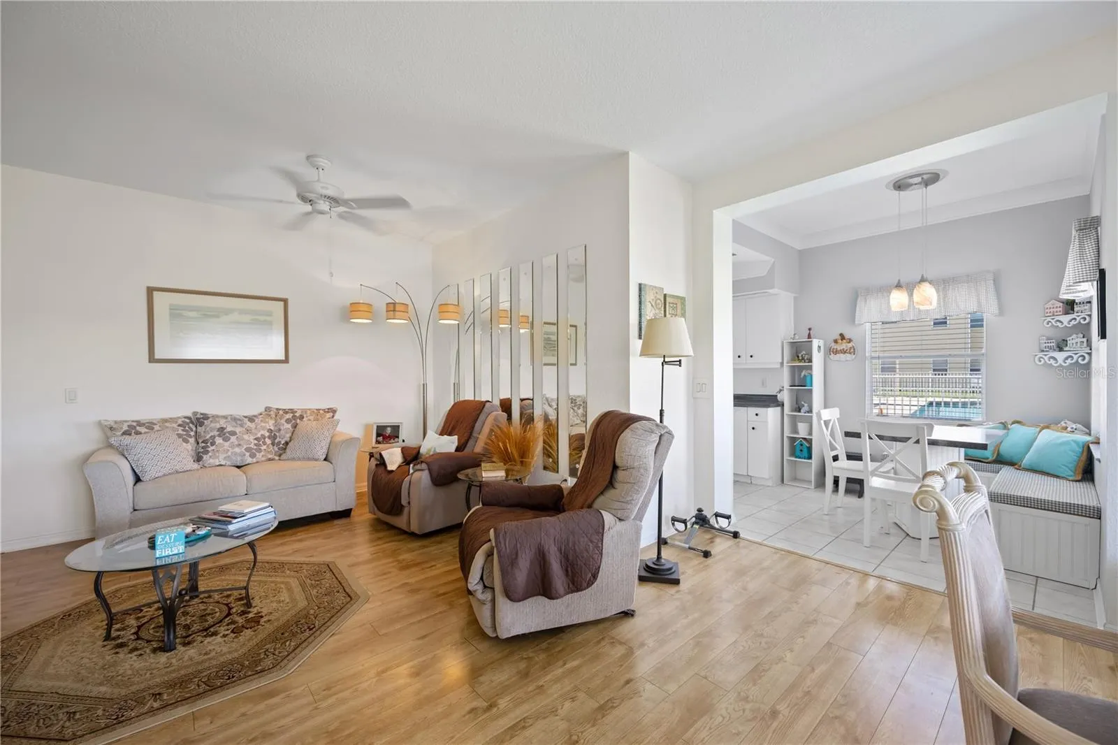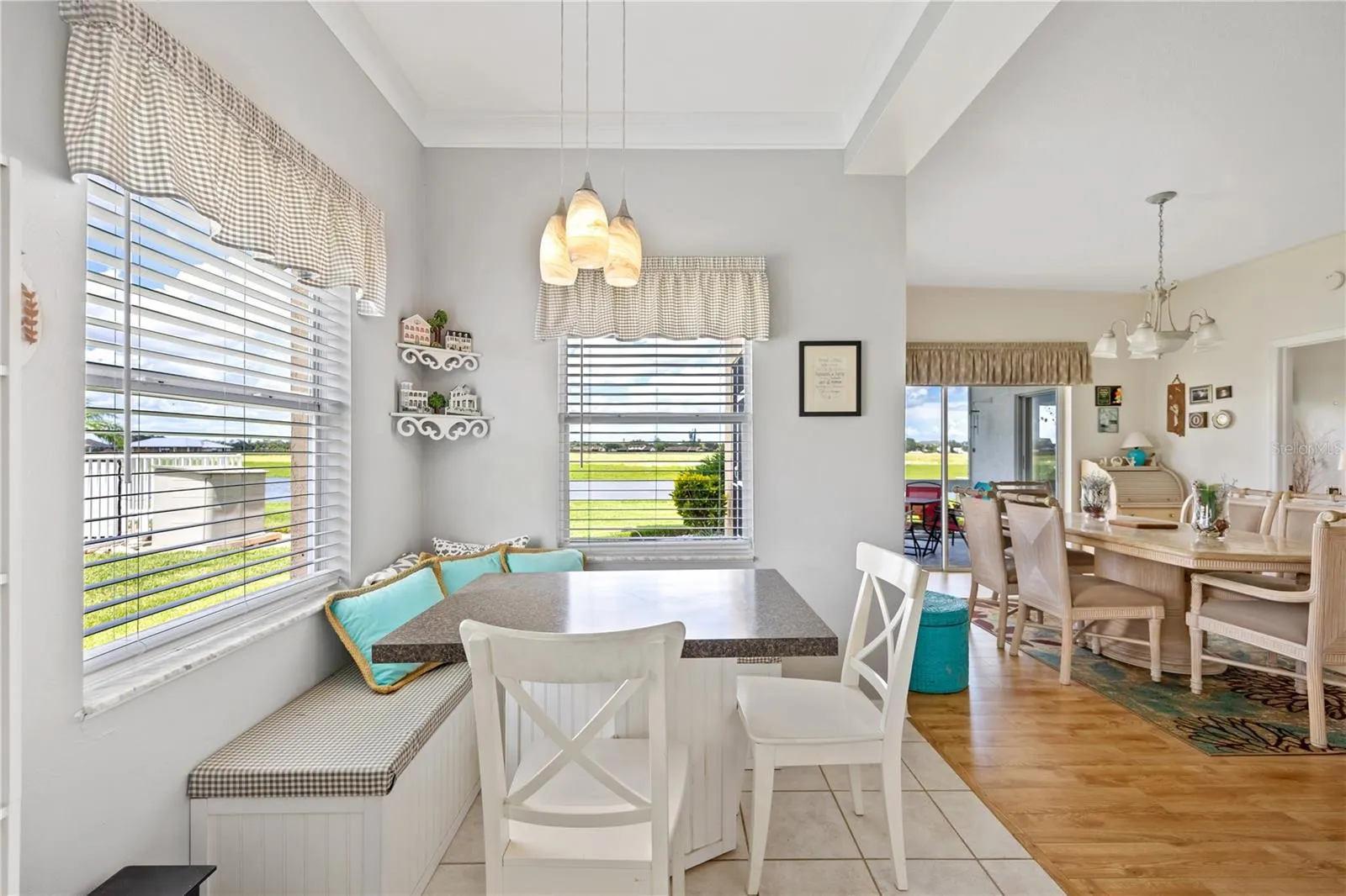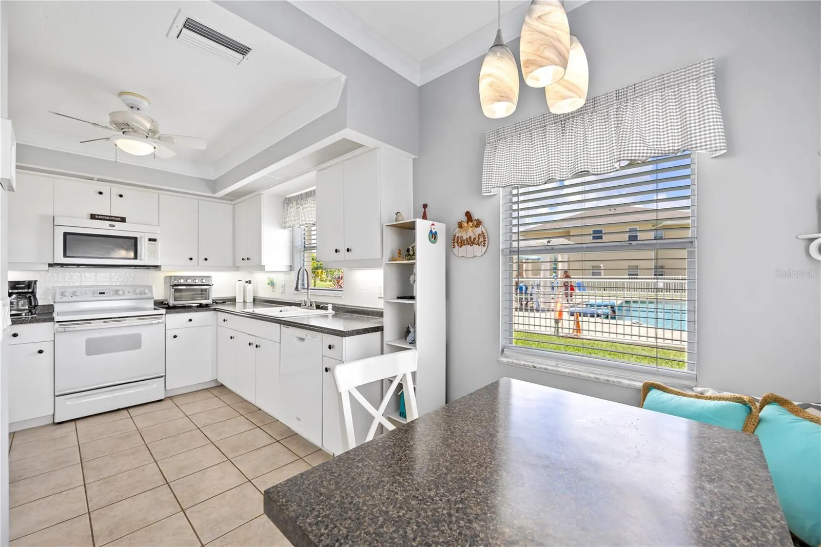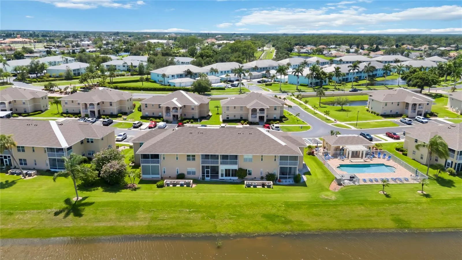 Beautifully updated ground-floor end-unit condo featuring 2 bedrooms, 2 bathrooms, and a carport with a lockable storage shed, ideally situated next to the pool with a tranquil waterfront view. This 1,313 sq. ft. residence (plus a 127 sq. ft. screened lanai with desirable eastern exposure) offers 9-foot ceilings and includes all major appliances—refrigerator, oven range, dishwasher, microwave, washer, and dryer—as well as furnishings, with a few wall hangings excluded. The kitchen’s U-shaped layout includes new countertops and a charming breakfast nook with built-in seating, while both bathrooms and the kitchen area feature crown molding. Additional upgrades include a new A/C system (2024), newer water heater (2023), and updated washer and dryer. Flooring consists of tile in the kitchen, baths, foyer, and laundry room, with light hickory laminate throughout the main living areas. The unit provides picturesque views of the cabana and heated pool (maintained at 86°F in winter) from the kitchen and dining area, and the rear lanai overlooks a serene, grass-lined lake. The community has been fully renovated with new roofs, fascia, soffits, gutters, exterior paint, carports, and landscaping following Hurricane Ian repairs completed in December 2025. Conveniently located near Coco Plum Plaza, Lowes, Home Depot, Walmart, Publix, and an array of restaurants, the property is also minutes from Wellen Park and the Atlanta Braves’ spring training facility. Offering exceptional value and a prime location, this move-in-ready condo combines comfort, convenience, and Florida lifestyle living.