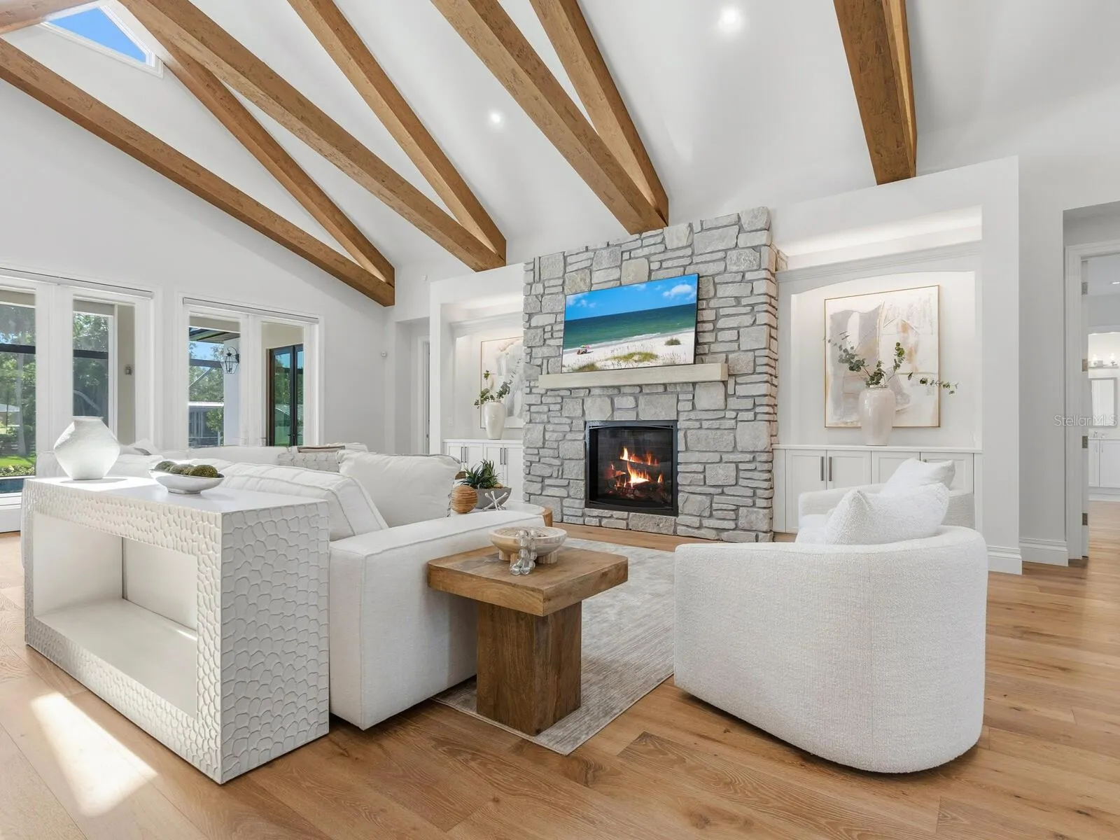 Construction and staging have been completed in this stunning new home by award-winning Trinity Custom Homes. Discover luxury and innovation in this remarkable four-bedroom-plus-den, 5.5-bath, West-of-the-Trail home. This custom-designed residence showcases superior craftsmanship, offering a sophisticated blend of modern design and top-tier functionality. Every detail has been meticulously planned, from the gourmet kitchen, which features Thermador appliances, a 42-inch refrigerator, a five-burner gas cooktop, double ovens, and abundant pantry storage, to the great room plan with a soaring, vaulted ceiling, wood trusses with LED uplighting and fireplace, ideal for fabulous entertaining and everyday living. The dining area features an entertainment center that includes a U-Line wine cooler and ice maker, as well as an Elkay water bottle filler and chiller. No detail was overlooked, from the Level 5 drywall finishes on walls and ceilings to the custom cabinetry in the great room, office, and bedroom closets. The outdoor space offers a resort-style retreat overlooking a serene, spring-fed lake, featuring a PebbleTec surfaced pool and spa, a lanai cage with a Clearview enclosure, and a motorized sunshade screen. The outdoor kitchen, complete with a gas grill, elevates the alfresco dining experience.