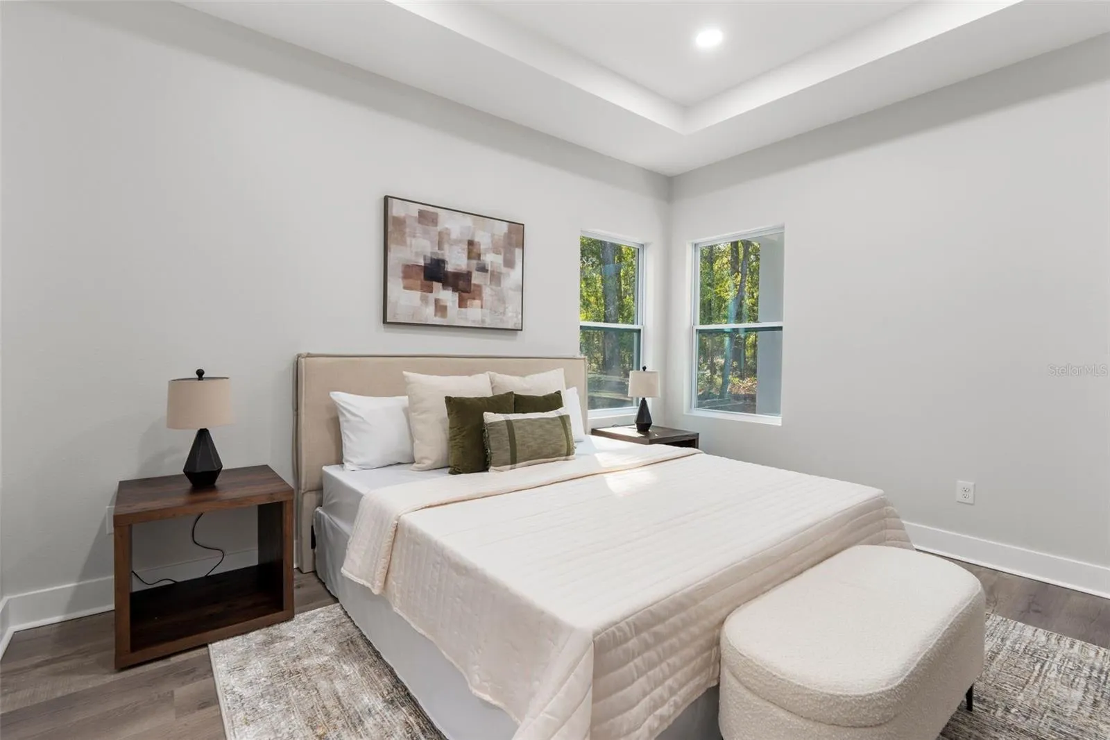The home embraces exquisite finishes with waterproof luxury vinyl plank flooring throughout, inviting you to experience elegance underfoot. The master suite is a sanctuary with a tray ceiling and an impressive walk-in closet. Retreat into a spa-like master bath with a stunning oversized shower, rain-head, and contemporary fixtures.