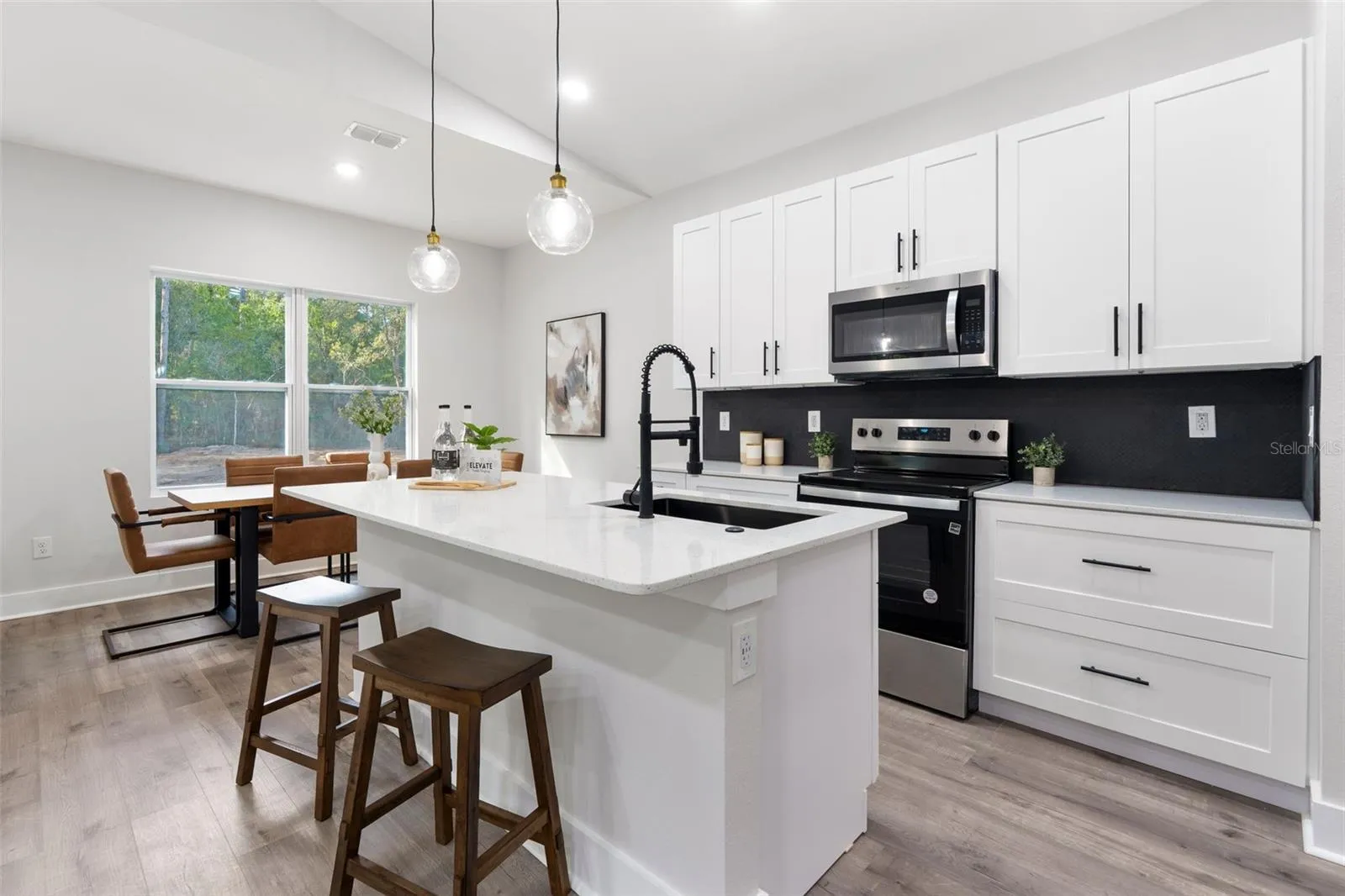 This move-in-ready gem is a testament to contemporary craftsmanship, featuring over $15k in luxurious upgrades. Picture yourself preparing meals in a chef’s paradise with 42″ solid Shaker wood cabinets, a stylish Quartz island, and European modern faucets that breathe life into every corner. The stainless-steel appliances and beautiful dining area facing serene backyard views make for an enchanting dining experience every day.